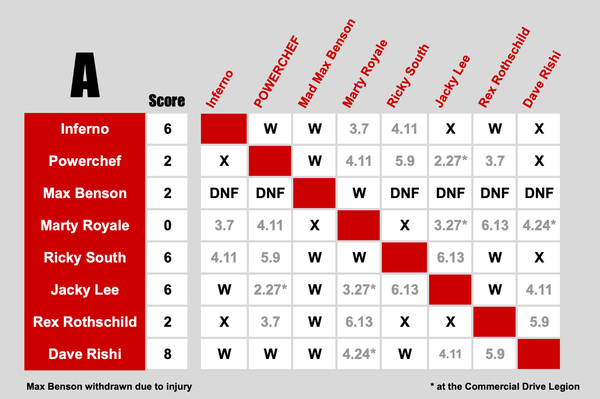 Kits League is BOOM! Pro Wrestling’s round-robin tournament series, hosted at St. James Community Square in Kitsilano. Wrestlers are divided into two blocks — Block A and Block B — with eight competitors in each. Every wrestler faces everyone else in their block one time, battling to rack up points: