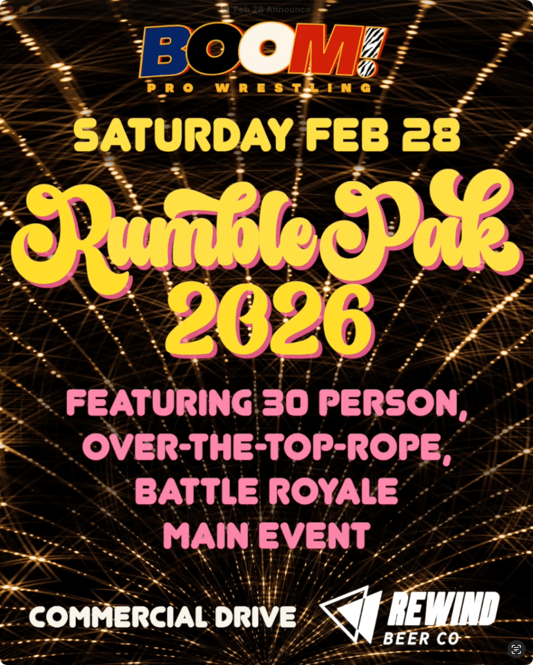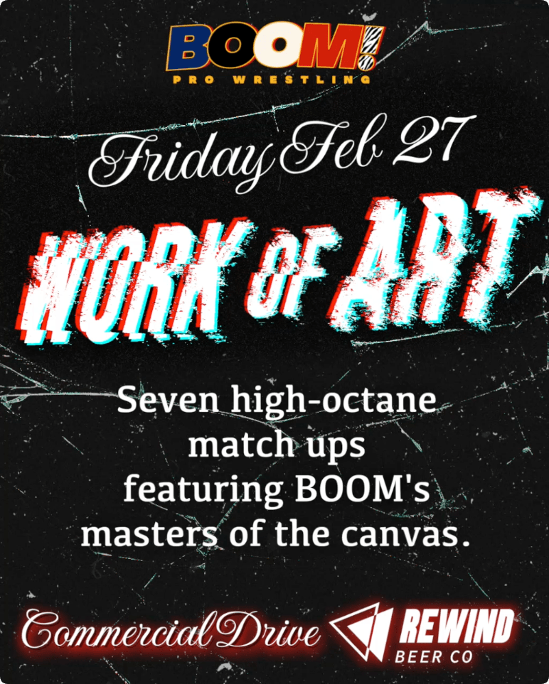 Tickets often sell out, so grab yours early and come see why BOOM! Pro Wrestling has become a go-to night out for Vancouver wrestling fans and newcomers alike.