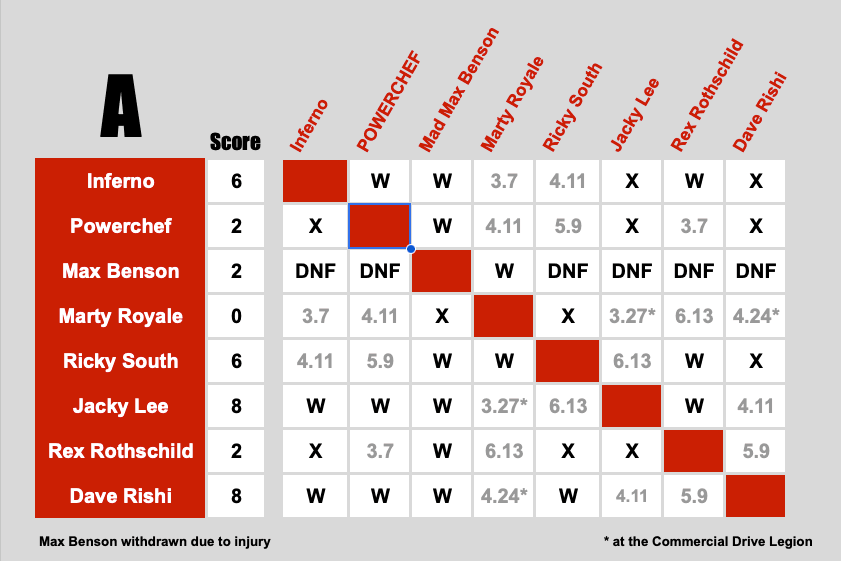 Kits League is BOOM! Pro Wrestling’s round-robin tournament series, hosted at St. James Community Square in Kitsilano. Wrestlers are divided into two blocks — Block A and Block B — with eight competitors in each. Every wrestler faces everyone else in their block one time, battling to rack up points: